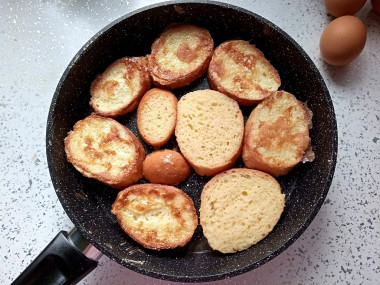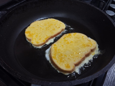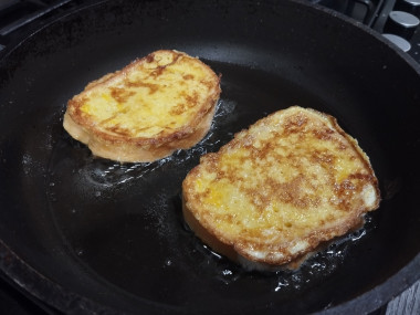 Периодически стоит приподнимать тост и следить за цветом. Так как в яичной смеси есть сахар, тосты могут быстро пригореть, если огонь будет слишком сильным. Как только тосты поджарятся, переверните их на другую сторону и жарьте ещё около двух минут. Подавайте тосты горячими. Приятного аппетита!