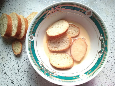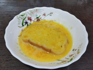 Сковороду разогрейте на сильном огне. Затем уменьшите огонь до среднего и растопите на сковороде сливочное масло. О том, как подобрать сковороду, а также как правильно выбрать масло, читайте в отдельных статьях, ссылки в конце рецепта. Хлеб обмакните в яичную смесь со всех сторон и сразу же выложите обжариваться на 2-3 минуты.