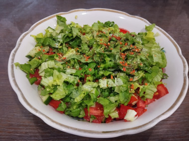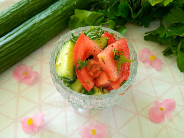 Весной хочется свежих салатов и вот салат с огурцами и помидорами с маслом один из таких. Готовится быстро, получается вкусно. Огурец и помидоры порезала небольшими кубиками, добавила измельчённую зелень, приправу для салатов, соль, немного перца, растительное масло и перемешала.