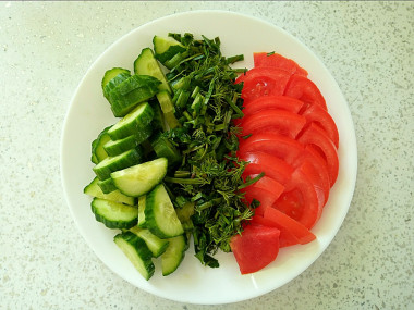 Зелень можно использовать любую по вкусу. Салат сделает более ароматным свежая зелень петрушки и укропа. Зелень промываем, просушиваем бумажным полотенцем и мелко рубим ножом. Салат зеленый или фиолетовый также придаст особый вкус салату, моем и мелко нарезаем ножом несколько листочков. Также можно добавить базилик, шпинат и кинзу, но совсем по чуть-чуть, они имеют ярко выраженный вкус, который может не всем понравится.