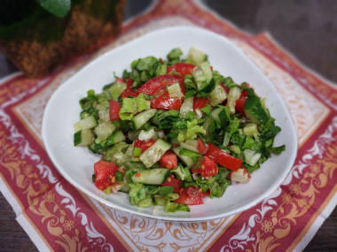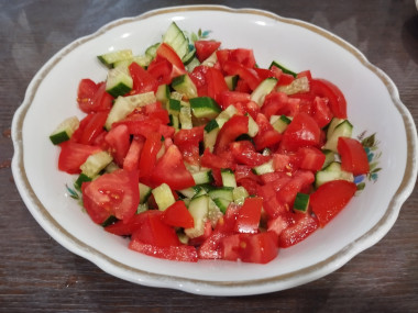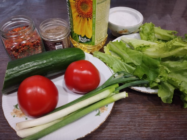 Ранней весной очень хочется свежих овощей и витаминов, которые в них содержатся. Конечно летом помидоры и огурцы гораздо вкуснее, но и сейчас любой овощ будет на пользу) Поэтому приготовила на ужин этот салатик. Из зелени у меня не было базилика и листьев салата. Чтобы добиться большего аромата, добавила в салат перья дикого чеснока. Это очень ароматная зеленушка, которая как раз начинает расти в огороде. Заправила салат пахучим нерафинированным горчичный маслом и посыпала свежемолотой смесью перцев. Получился сочный, ароматный, хрустящий салат с огурцами и помидорами с маслом, который мы ели с мясными котлетами. Ну, а мужу предложила этот салат с постными гороховыми котлетами.