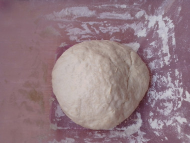 После того, как тесто подошло, смазываем руки растительным маслом (масло поможет тесту не прилипать к рукам) и слегка вымешиваем его, затем разделяем на 9 одинаковых порций. Формуем из каждой части аккуратный шарик, подпыляем разделочную доску мукой и раскатываем пласт толщиной 0,7-0,8 см.