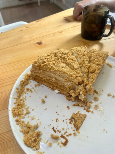 Получился торт самый вкусный. Он мягкий, нежный, пропитанный, сладкий, с медовым вкусом и ароматный. Превосходный торт на любой праздник. Все мы были в восторге от вкуса и аромата этого торта. Восхитительный рецепт! Огромное спасибо автору за шикарный торт😊