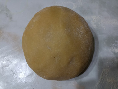 Когда тесто станет собираться в один ком, вываливаем его на стол, присыпанный мукой.