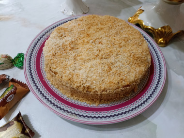 Обрезки от коржей измельчаем, я это делала в блендере, можно пройтись по ним скалкой. Густо посыпаем ими верх и бока торта. Торт получится вкуснее, если простоит несколько часов в холодильнике.