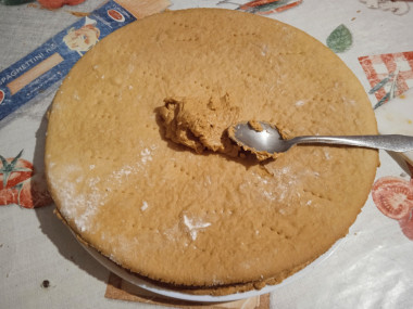 Начинаем собирать торт. Посуду, в которой он будет подаваться, смазываем немного кремом, кладем первый корж. смазываем его обильно кремом.