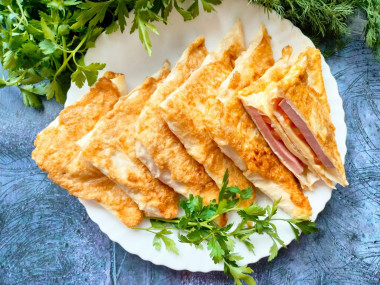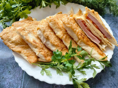 На завтрак приготовила треугольники из лаваша с начинкой сыром и колбасой по этому рецепту. Колбаску я взяла докторскую, сыр российский. Обжаривала треугольники по 2 минутки с каждой стороны. Готовится блюдо очень легко и быстро!