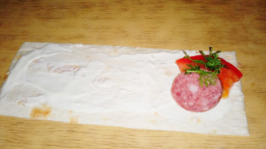 В начале каждой полосы лаваша выложите начинку: ломтик колбасы, ломтик помидора и сыр.