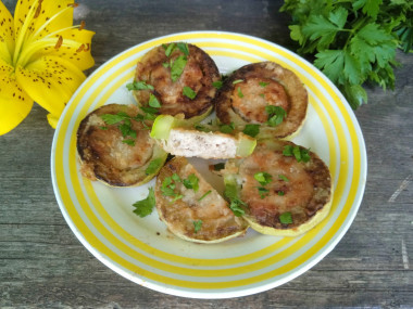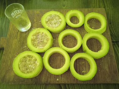 Фарш ещё раз хорошо перемешайте. Наполните каждый кабачок фаршем. Не набивайте слишком плотно, чтобы начинка не была выпуклой иначе в процессе обжаривания она отсоединится от кабачка и внешний вид блюда будет не столь аппетитным.