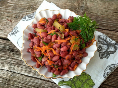 Замечательный сытный салат из фасоли с морковью и луком. Муж такой просто обожает, особенно за то, что в нем нет майонеза) Я использовала заранее отваренную красную фасоль, так что времени на приготовление салата тоже не много ушло. Лук я обжаривала отдельно, хотела, чтобы он стал золотистым с карамельным привкусом. А потом уже добавила морковь. На мой вкус все составляющие салата отлично гармонируют, все сочетается. Вкус приятный и для нас привычный. Такой салат у нас на столе бывает часто, только соленые огурцы не добавляла раньше, с ними салат стал интереснее) За счет фасоли этот салат можно подать в качестве вкусного гарнира.