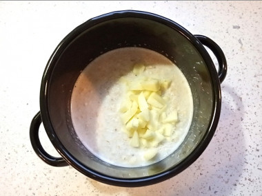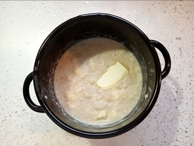Овсянка у меня такая, которую надо варить 5 минут, среднего помола. Персик заменила яблоком, которое очистила и нарезала мелкими кусочками. Корица с яблоком, на мой взгляд, даже лучше сочетается. Сначала проварила минут пять овсянку с молоком и водой. Затем добавила яблоко, сахар, соль и варила еще несколько минут. В конце положила в кастрюлю кусочек сливочного масла для бархатистой консистенции и вкуса.