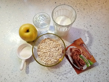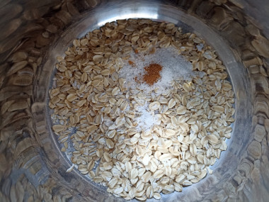 Итак, в кастрюле подходящего размера соединяем вместе овсяные хлопья, коричневый сахар, щепотку соли и молотую корицу. Последнюю можно использовать по желанию, а коричневый сахар заменить на белый или и вовсе обойтись без него. Если фрукты сладкие, то подсластителе, в общем-то, смысла нет. Все перемешиваем и заливаем смесь молоком и водой, снова мешаем. Фрукты тоже добавляем к остальным ингредиентам.