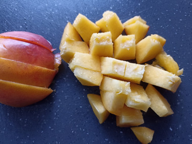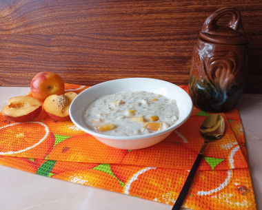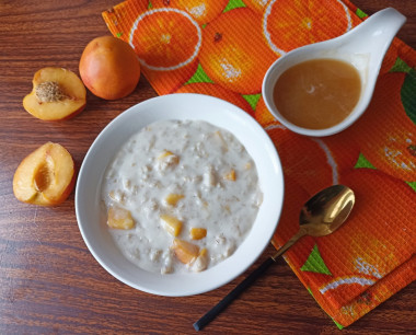Заранее для каши нужно подготовить только фрукты - вымыть, очистить, если нужно, нарезать небольшими кубиками. В рецепте предлагается использовать персики, но подойдут любые! Лучше - сочные, сладкие и мягкие. Но и с кисленькими яблочками тоже будет вкусно.