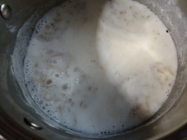 Ставим кастрюльку на средний огонь, доводим смесь до кипения, затем нагрев убавляем до минимального, прикрываем кастрюльку крышкой и варим хлопья согласно инструкции на упаковке - необходимое для готовности время. Можно также кашу приготовить в микроволновке или мультиварке, воспользовавшись режимом "Каша" или "Экспресс-крупы".