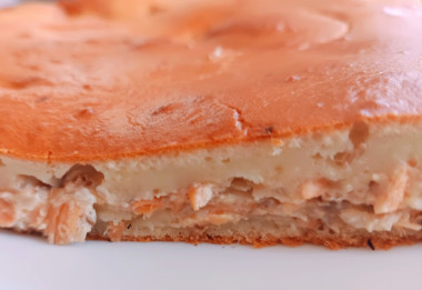 Мы покупаем обрезь сёмги, обычно просто тушим. Но всегда хочется разнообразия и в этот раз испекли заливной пирог с рыбой на кефире.