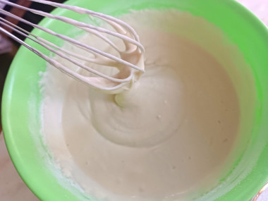 Подготовьте ингредиенты для теста. Кефир заранее выньте из холодильника, он должен быть комнатной температуры. Заранее включите духовку на 180 градусов. В миску вбейте яйца и добавьте соль. Венчиком или миксером взбейте ингредиенты до получения однородной по консистенции смеси. Влейте кефир комнатной температуры и перемешайте.