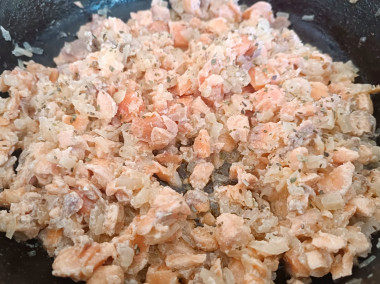 Очень простое и быстрое в приготовлении тесто. Всё просто смешивается и получается однородное тесто по консистенции, как густая сметана. Ну а с начинкой не пришлось долго возиться, рыбу нарезала кубиками, измельчённый лук репчатый пассеровала до полупрозрачности. Рыбу не стала доводить до готовности, а лишь слегка прогрела, чтобы начинка была более сочная.