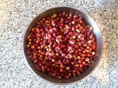 Во время варки пришлось добавить пару еловых веточек. Мне показалось, что эти "малышки", напоминающие визуально землянику, обладают не слишком выраженным ароматом. Вместо цитрусового сока использовала кружки лимона. В итоге получилось очень вкусное варенье, напоминающее больше сироп. Зимой таковой придется в самый раз с блинчиками или в качестве топпинга в чай.
