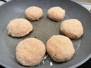 Налейте на сковороду растительное масло, прогрейте его и выложите котлеты. Жарьте с одной стороны на медленном огне 5-7 минут. Переверните котлеты на другую сторону и жарьте такое же время. Куриное мясо готовится быстро, так что за 10-15 минут котлеты полностью приготовятся. Жарьте таким образом все заготовки.