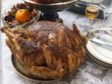 А у меня был не гусь, а индейка, а приготовила и полила ее совсем для меня новым соусом, состоящим из меда, гвоздики, уксуса,корицы, черного шоколада, молотого имбиря, растительного масла, соли и молотого чили.