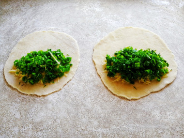 Пока готовое тесто отдыхало, занялась приготовлением начинки - натерла сыр, нарезала зеленый лук, укроп и петрушку. Перемешивать сыр и зелень не стала. Выкладывала на раскатанные из теста лепёшки сначала сыр, а на него зелень. Начинку размещала на одной половине лепешек. Второй половинкой закрывала её, защипывала край кутаба и отправляла на разогретую сухую сковородку. Держала там, пока тесто не зарумянивалось. Смазывала готовые кутабы сливочным маслом, отчего они стали мягкие и нежные. Зелень внутри кутабов осталась такой же свежей и хрустящей, а сыр расплавился. Получилось чудесно! Вкусно и сытно! Особенно понравились кутабы мужу!