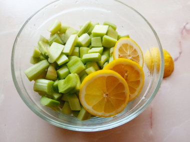 В кастрюлю добавьте кусочки ревеня и ломтики лимона. Доведите компот до кипения и варите ещё около 5 минут.