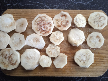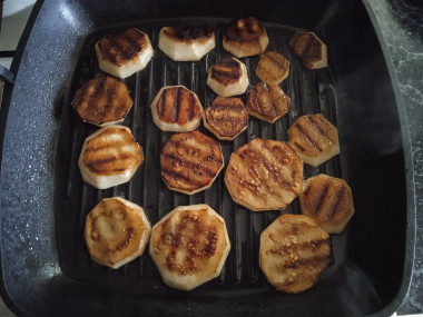 Сперва наперво я счистила у баклажана шкурку, мне она показалась жёсткой. После присолила на всякий случай. Обжаривала кружки баклажана на растительном масле без запаха. Из специй положила лишь соль и немного перца. Вместо лайма у меня был лимон. Жарила на сковороде гриль по описанию в рецепте. А вот чесноком смазала уже обжаренные баклажаны гриль. Я побоялась, что чеснок на сковороде начнет гореть.