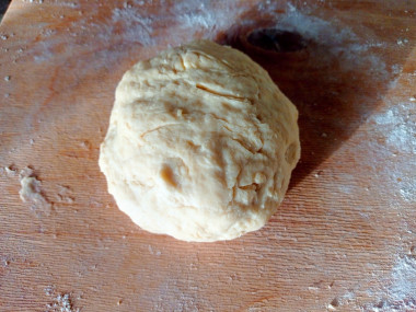 Скатайте тесто в шар. Слегка присыпьте мукой не только сам шар, но и место под ним. Накройте тесто пищевой пленкой и оставьте на 15 минут для отдыха.