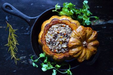 Тыкву переверните, наполните подготовленной начинкой и накройте крышечкой.