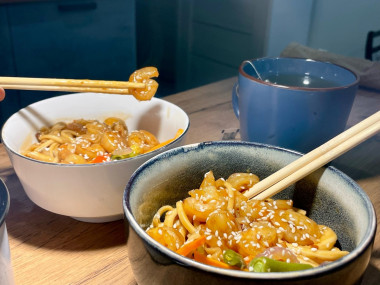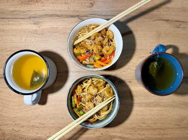 Приготовила на ужин удон с креветками и овощами. Готовить блюдо несложно, главное - приготовить заранее все нужные компоненты блюда. Удон получается с насыщенным вкусом морепродуктов, а разнообразные добавки делают общий вкус еще ярким и колоритным. Спасибо большое за рецепт!
