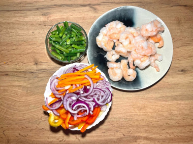 Как сделать лапшу удон с креветками и овощами в соусе? Подготовьте продукты. Креветки лучше возьмите уже очищенные, с ними процесс будет быстрее и проще. Подойдут как вареные, так и сырые. Разница будет лишь во времени приготовления. Если же креветки у вас в панцире, то очистите их. Замороженные креветки достаньте за полчаса до готовки — этого времени хватит. Вместе с креветками выньте и фасоль, если она не свежая.