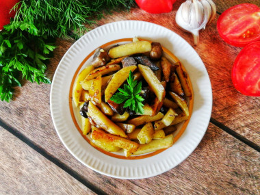 Грибы я сразу отправила на сковородку, на которой уже жарился репчатый лук. Жарила их до полуготовности. Затем выложила нарезанную брусочками картошку, перемешала. Жарила всё на среднем огне, не закрывая крышкой, пока картошка не "схватилась", стала глянцевой и как бы полупрозрачной. Затем добавила соль, закрыла сковородку крышкой и довела картошку до готовности.