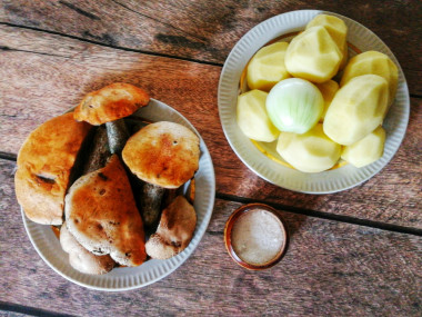 Подготовьте все необходимые ингредиенты. Белые грибы лучше всего собирать самостоятельно, чтобы быть полностью уверенными в их безопасности. Свежесобранные белые грибы очистите от веток, травинок и земли. Нарежьте грибы крупными кусками и хорошо промойте в проточной воде. Затем залейте водой, доведите до кипения. Сколько варить грибы для жарки с картошкой? Проварите грибы около 15 минут. Не забывайте снимать пенку. Затем отварные грибы откиньте на дуршл