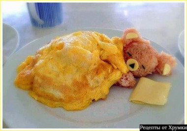 Готовим самый омлет, но для того чтобы наш омлет не рассыпался, нужно добавить немного тертого сыра и столовую ложку любого майонеза. Затем из сваренного риса формируем медвежонка или кого-то другого. Можно нарисовать рожицу сосиске. Накрываем медведя, или кто у нас там получился омлетом, и все креатив готов.