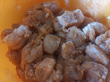 Снова перемешайте, чтобы мясо равномерно было покрыто мучной смесью.
