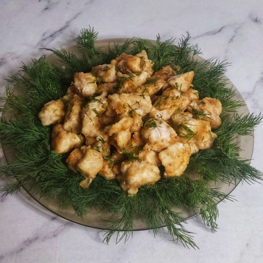 Когда мясо поджарится с одной стороны, переверните все кусочки и обжарьте до аппетитной, румяной корочки с другой стороны. Готовое мясо выложите на тарелку, застеленную бумажными полотенцами, чтобы с кусочков стек лишний жир. Подавайте вкусное куриное филе кусочками в горячем виде! Приятного аппетита!