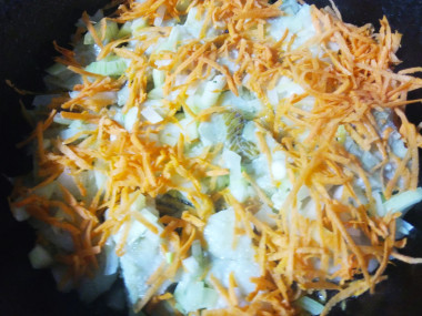 Добавьте к рыбе лук, обжарьте пару минут. Добавьте морковь.