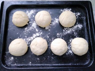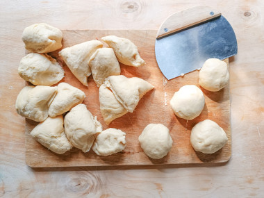 Готовое тесто разделите на одинаковые кусочки. У меня из половины порции получилось 8 штук, вес каждого около 80 граммов.
