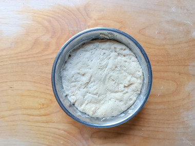 Добавьте необходимое количество муки и замесите опару. Она получится довольно густой. Месить долго не нужно, просто перемешайте до объединения всех продуктов. Накройте миску полотенцем и оставьте на 3 часа для подъема.