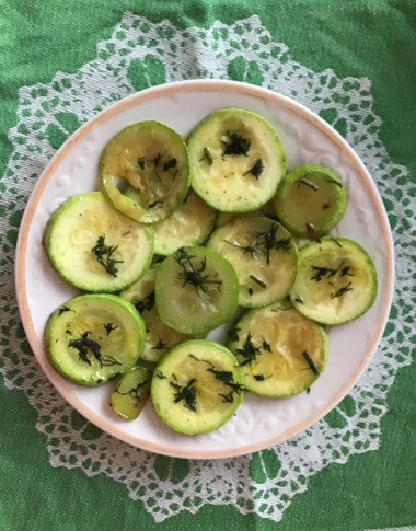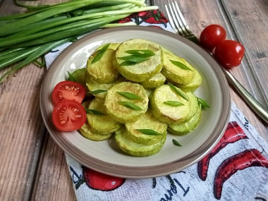 Готовые кабачки уберите с огня, разложите по тарелкам. Посыпьте рубленой зеленью и подавайте к столу. Приятного аппетита!