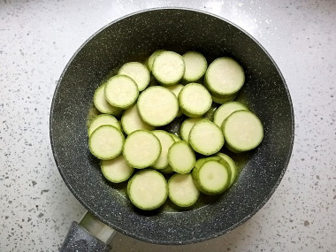 Кабачки тщательно помойте и обсушите. Если кабачок небольшого диаметра, то нарежьте его кружочками толщиной не более 2 см. Если кабачок крупный, то дополнительно разрежьте кружочки на половинки или четвертинки.