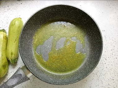 У меня было два маленьких кабачка, нарезала их кружочками толщиной 1-1,5 см. На сковороде растопила сливочное масло и добавила в него куркуму, красного перца на кончике ножа и щепотку карри. Решила сначала немного обжарить кабачки в этом ароматном масле. Сделать это просто, примерно как картошку жарить).