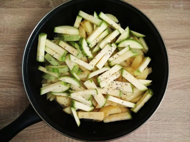 Добавьте кабачки в сковороду к картофелю. Жарьте все вместе в течение примерно 10 минут, периодически перемешивая.