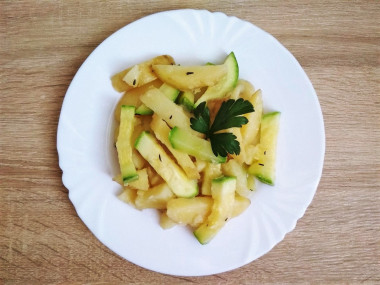 Готовую картошку с кабачками разложите по тарелкам и сразу же подавайте, пока блюдо горячее. Приятного аппетита!