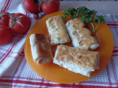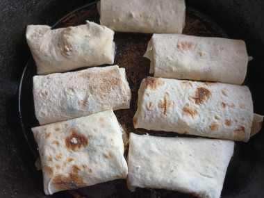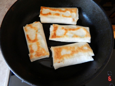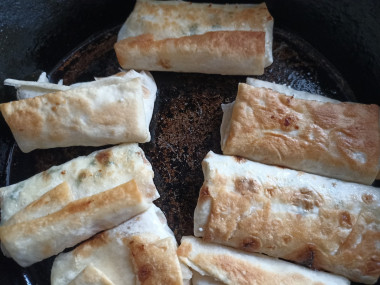 На сковороду налейте растительное масло и разогрейте. Выложите конвертики из лаваша на сковороду швом вниз, чтобы они не развернулись во время жарки. Огонь убавьте до среднего. Когда конвертики станут золотистого цвета с одной стороны, переверните их и дайте подрумяниться со второй стороны. Накройте сковороду крышкой и дайте начинке немного потушиться на огне, не более 7 минут. Как выбрать сковороду и масло для жарки читайте в конце рецепта.