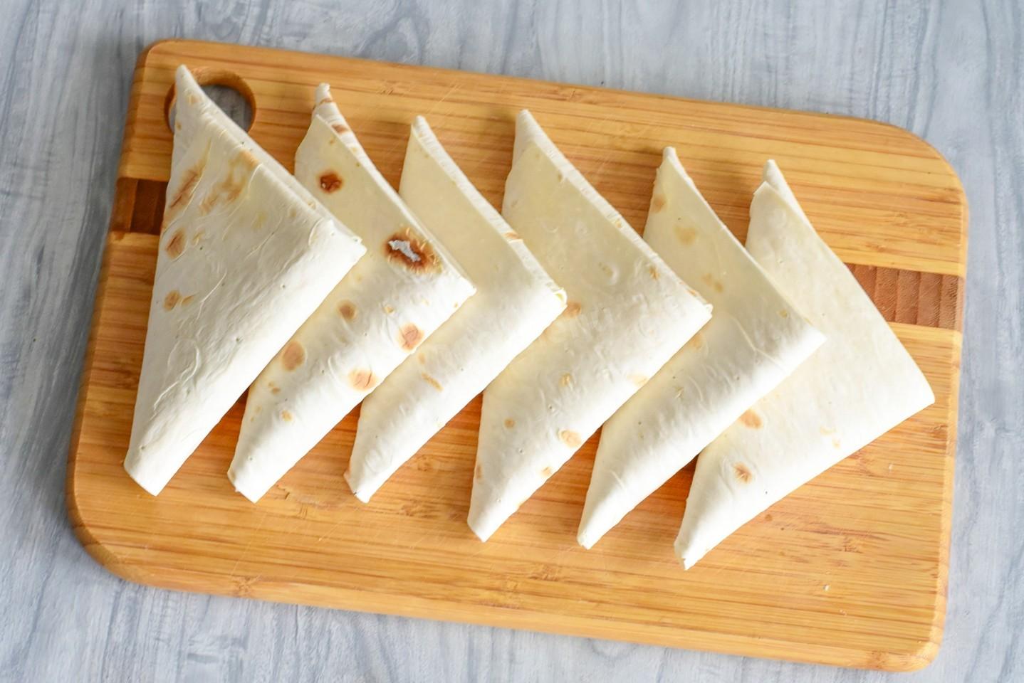 Подготовьте ингредиенты. Конвертики из лаваша можно делать любой формы. Я сделала в виде треугольников. Процесс приготовления этой закуски простой, но нужно соблюдать некоторые правила, чтобы получилось красиво и вкусно. Пакет с лавашом нужно открывать непосредственно перед самим приготовлением закуски, чтобы он не высох. Если лаваш стал сухой, он может поломаться на сгибах, чтобы этого избежать, нужно сбрызнуть его водой.