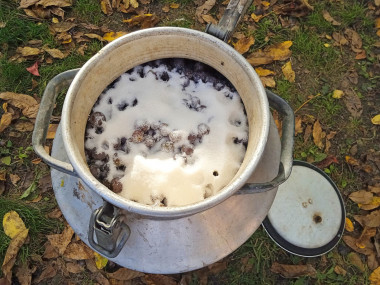 Далее ягоды нужно раздавить, не повреждая косточек. Лучше всего это делать руками. Наденьте одноразовую перчатку для удобства. Я ягоды раздавливаю порциями. Так получается максимально извлечь ароматного сока. Полученная смесь из сока и раздавленных ягод называется "сусло".