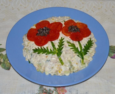 Нижний край салата обсыпьте по всей окружности рубленым укропом. В центре салата сформируйте лепестки маков из кружочков помидоров. В центр каждого цветка установите по маслине. Вокруг маслин посыпьте маком. Из целых веточек укропа сделайте листики. Поставьте салат на 2 часа в холодильник для пропитки. Приятного аппетита!