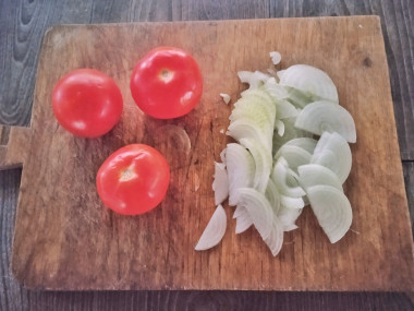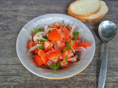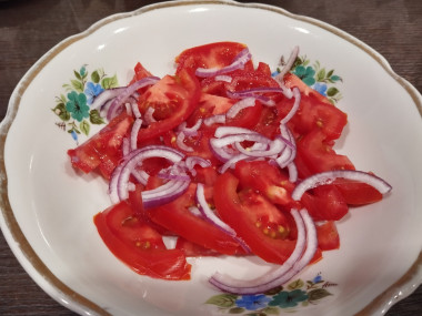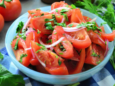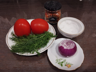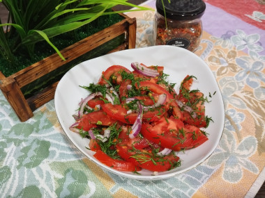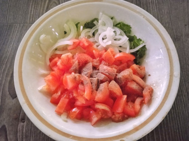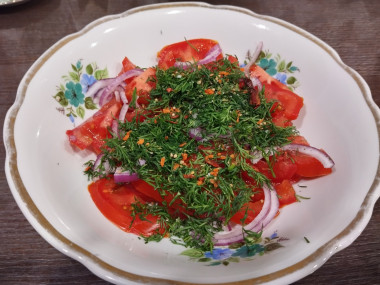 Лук я использовала красный, который порезала полукольцами ,а из зелени укроп, я его мелко порезала. В глубокий салатник выложила порезанные дольками помидоры, добавила лук,зелень, специи,слегка посолила. Всё аккуратно перемешала. Оставила на 20 минут,чтобы ингредиенты пропитались ароматом друг друга.