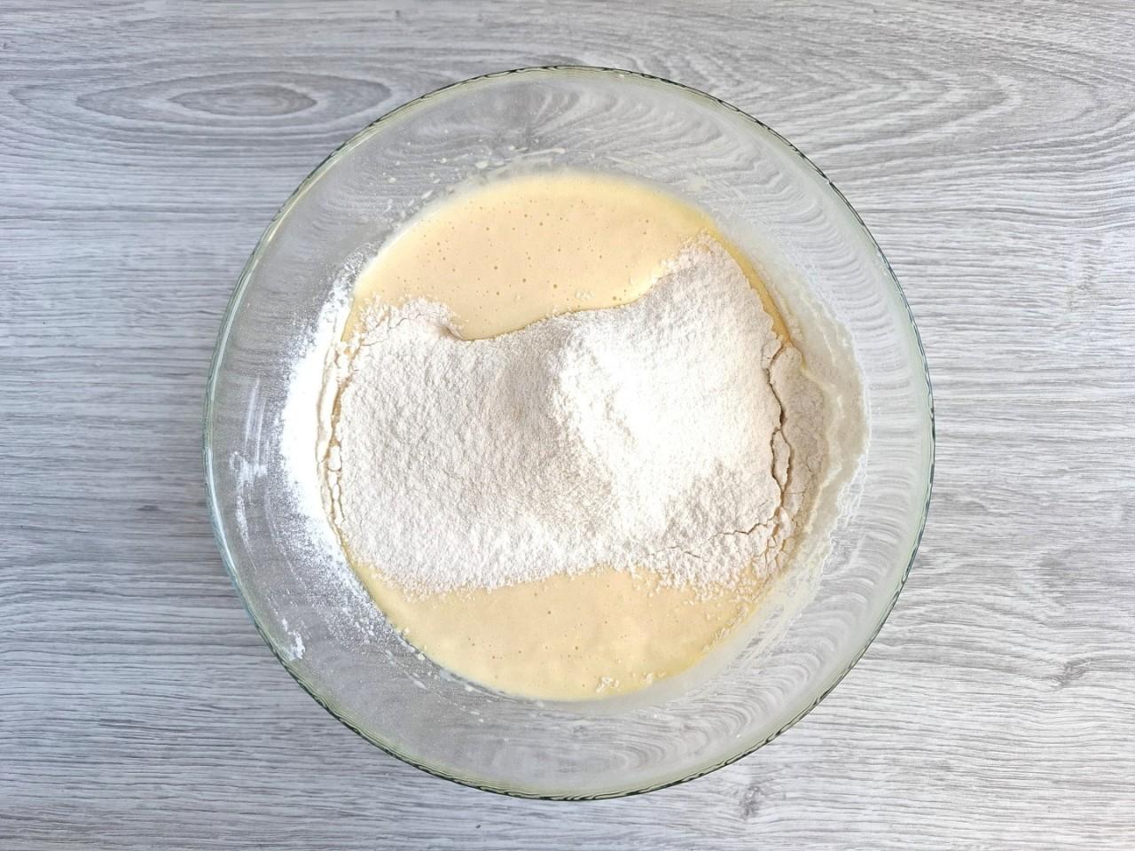 Добавьте кефир с к яично-масляной смеси, аккуратно перемешайте и начинайте порциями подсыпать муку. Ее количество придется контролировать на свое усмотрение, ведь качество самой муки, размер яйца и густота кефира будут варьироваться, а значит, объем муки может уменьшиться или увеличиться от указанного в рецептуре.